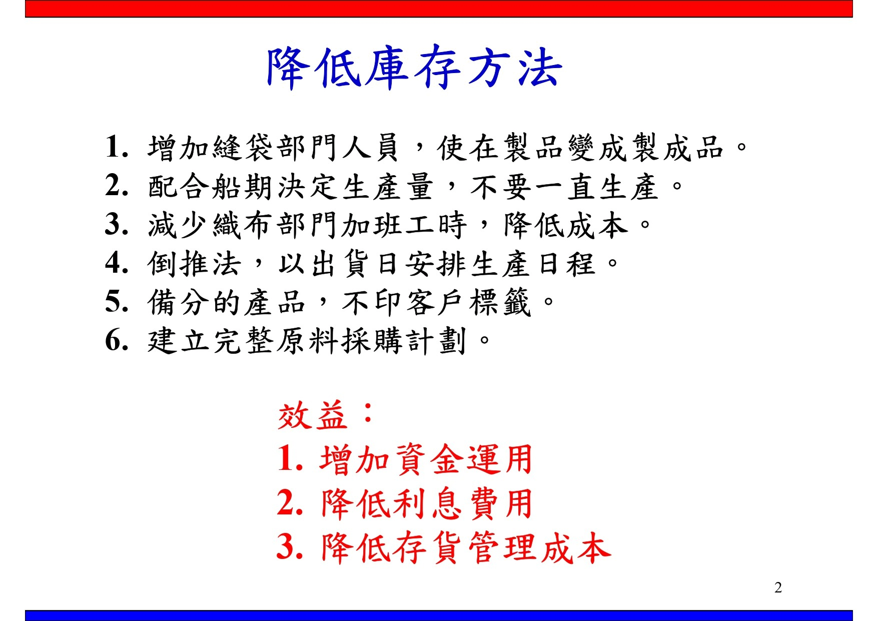 1.增加縫袋部門人員,使在製品變成製成品。