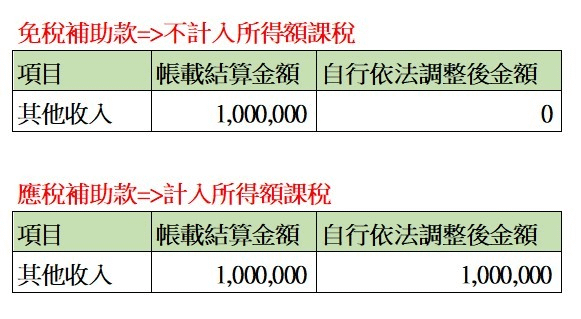營利事業符合條件領取政府核發之補助款,區分為免稅收入及應稅收入,