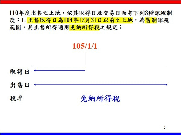 1.出售取得日為104年12月31日以前之土地,為舊制課稅範圍,土地交易所得免納所得稅。