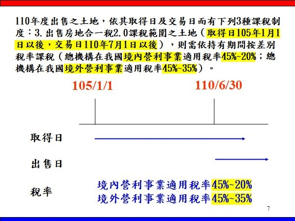 3.出售取得日105年1月1日以後,交易日110年7月1日以後,稅率為營利事業所得稅稅率20%~45%。百大會計師事務所 蔡淑惠錢師
