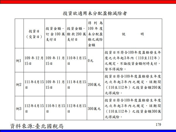 公司賺了錢一定要分配嗎?若分配股利股東稅賦很重怎麼辦?若不分配國稅局要加徵未分配盈餘5%?適用對象:公司賺錢,且投資金額在100萬以上,一定要留意是否可適用。公司適用實質投資未分配盈餘減除之租稅優惠5%為鼓勵企業進行投資,產業創新條例第23條之3規定,公司或有限合夥事業自辦理107年度未分配盈餘加徵營利事業所得稅申報起,因經營本業或附屬業務所需,於當年度盈餘發生年度之次年起3年內,以該盈餘興建或購置供自行生產或營業用之建築物、軟硬體設備或技術,實際支出金額之合計數達新臺幣(下同)100萬元,該投資金額得列為當年度未分配盈餘之減除項目。百大會計師事務所 蔡淑惠會計師